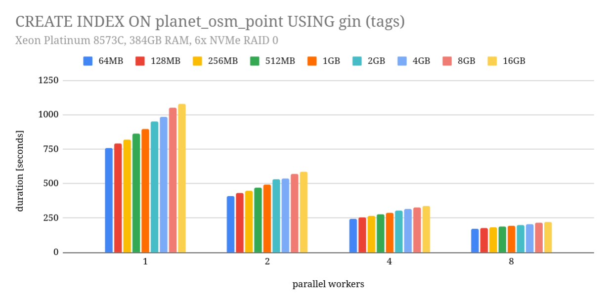 但图表还显示,增加 maintenance_work_mem 反而使得处理变得更慢!从 64MB 增加到 16GB 后,耗时增加了 30%,无论使用多少工作线程。